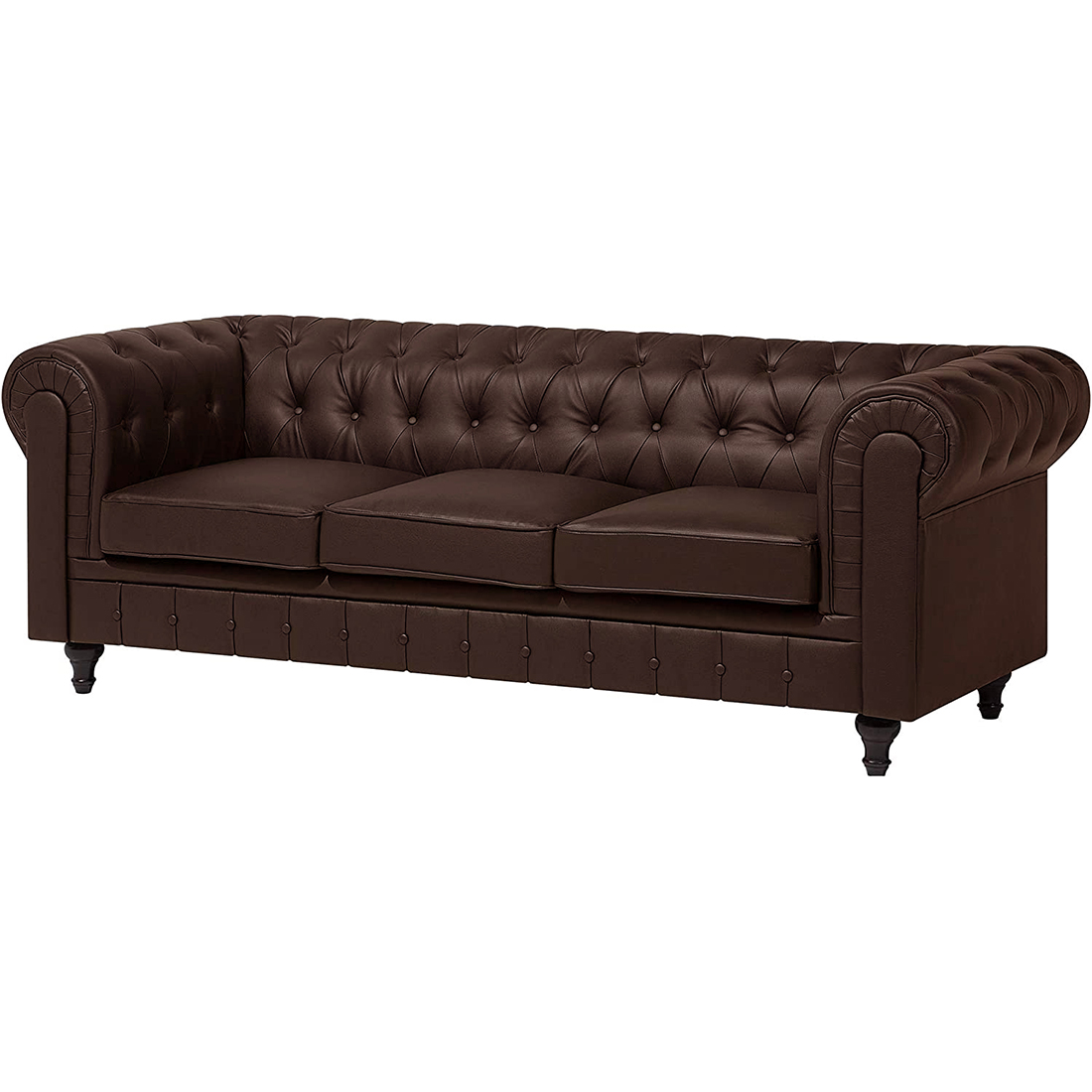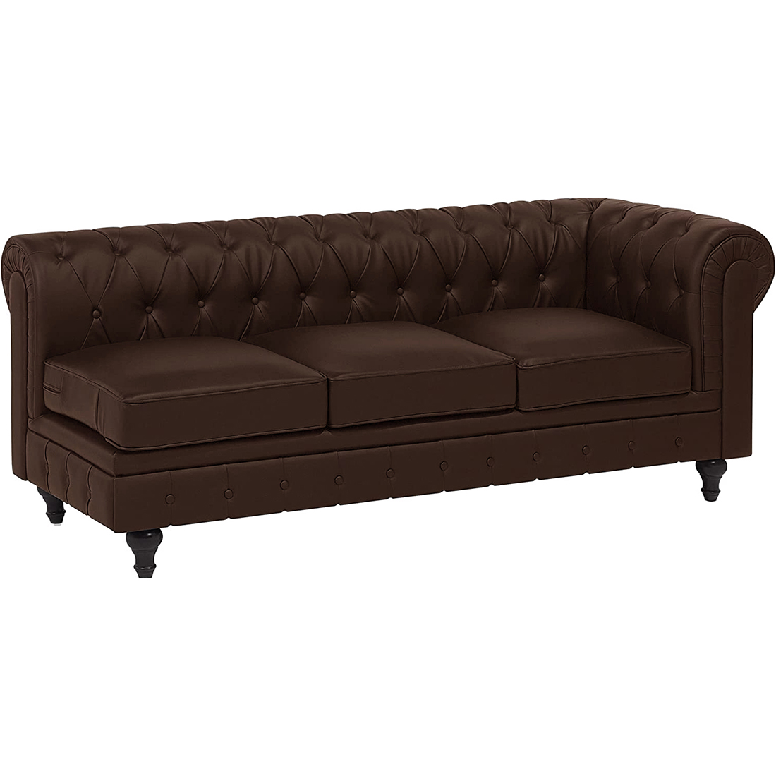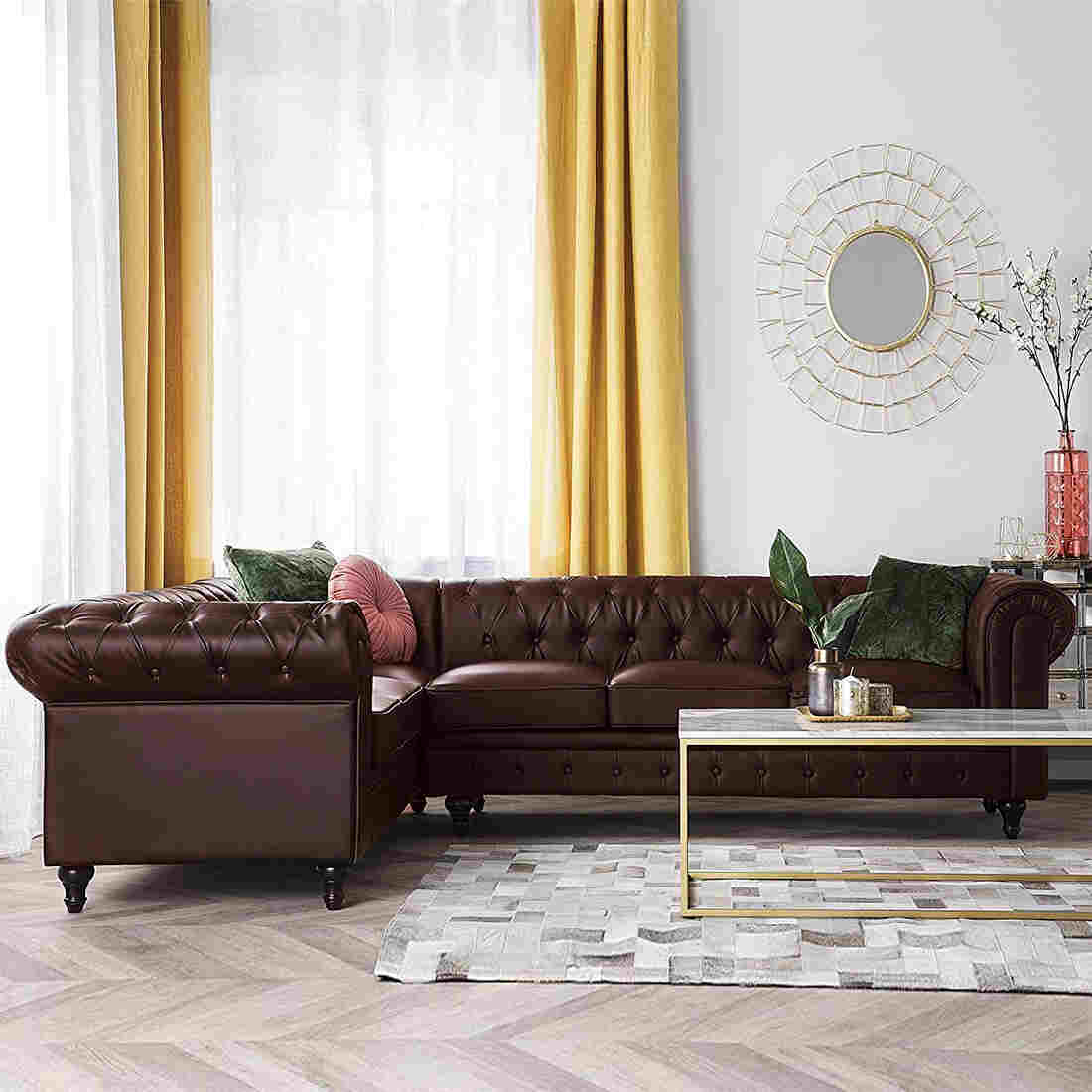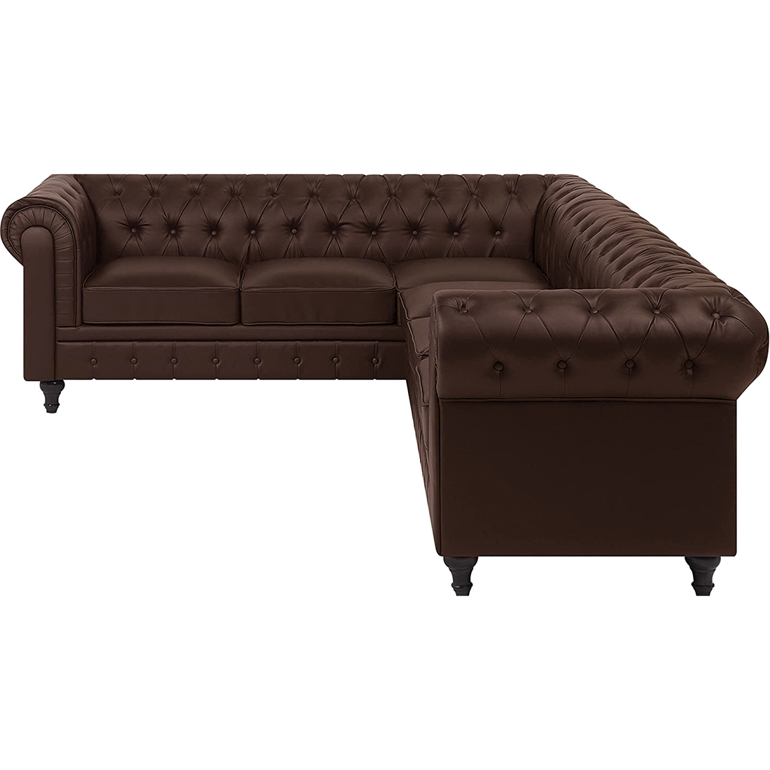 SHINE WOOD ART L-Shape 6-Seater Sofa/Luxury Corner Sofa This Chesterfield corner sofa is the perfect blend of comfort and sophistication and will make a great addition to any home or office. This 6-seater sofa, with its tufted and studded detailing and gracefully curved arms, will add a touch of luxury, class and style to any interior. The thickly padded seat is highly comfortable, while the elegant structure is sturdy and durable. The quality faux leather upholstery is easy to clean and hard-wearing.