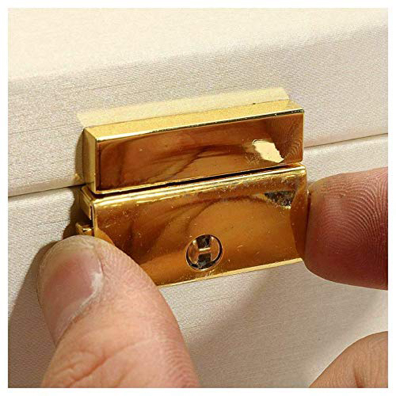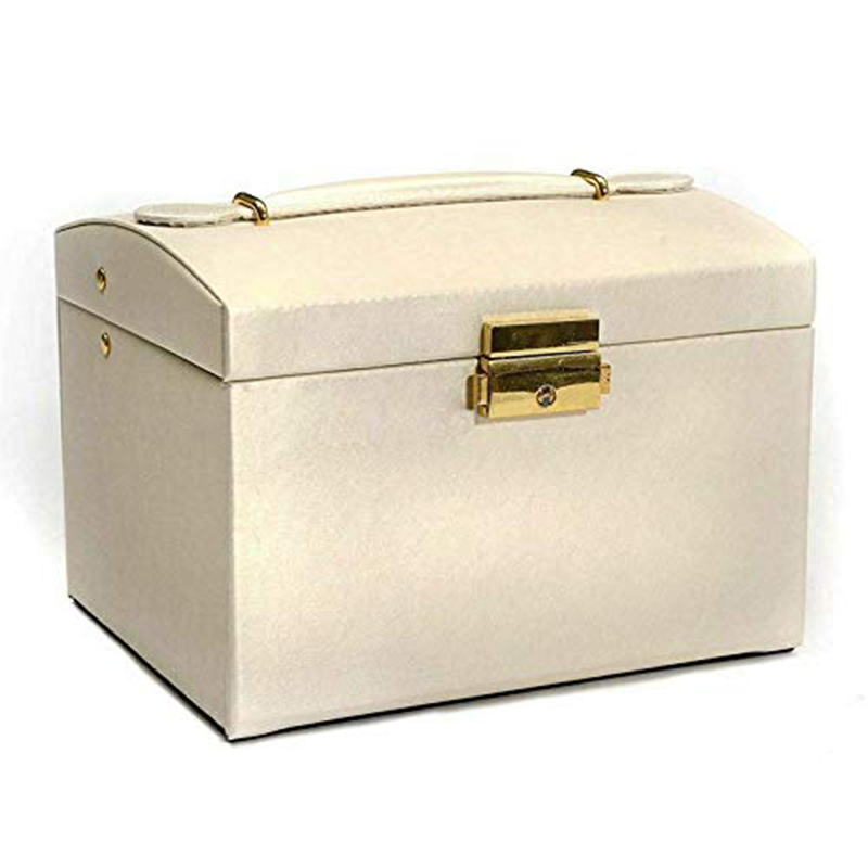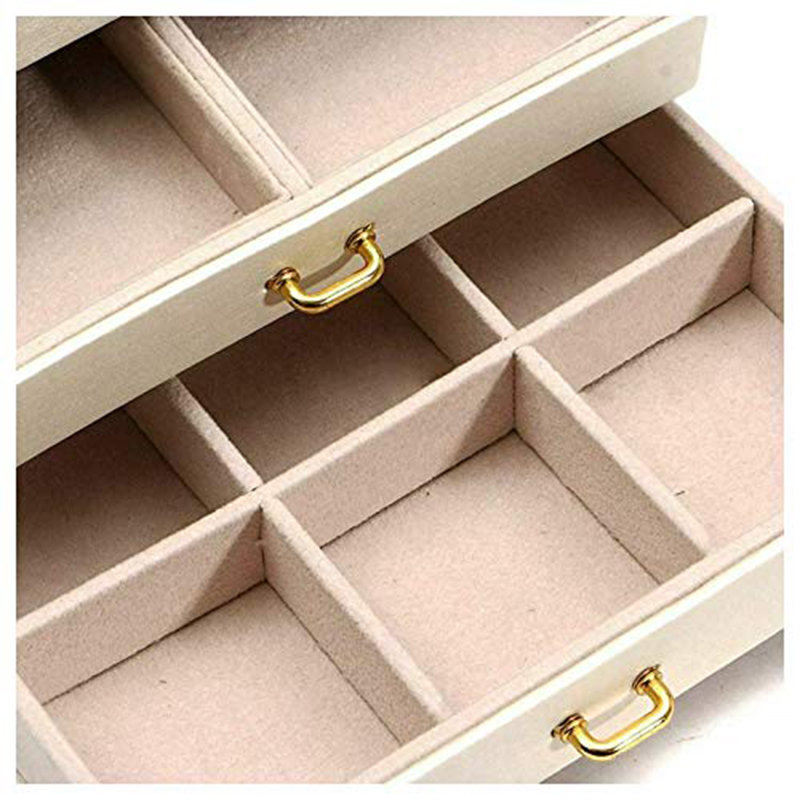 : Three-layer Jewelry Storage Box, Flannel Material. It Can Store Accessories Such As Earrings, Earrings, Necklaces, Bracelets, Ring Brooches And Watches. High-quality Hardware Lock Durable And Not Easy To Break, Easy To Open And Close. Earring Stud Storage Hole Neatly Arranged, Clear At A Glance Three-layer Design, Layered Different Types, Large Space. 24*17*11Cm Large Capacity. The First Layer: 8 Hooks, Fifteen Ring Slots, 10 Pairs Of Earring Hooks, 18 Pairs Of Stud Holes, 9 Small Grids, 1 Medium Grid. The Second Layer: Six Bracelets, Watch Storage Compartment. The Third Layer: Drawer Type, 18 Small Compartments, 1 Large Compartment.
