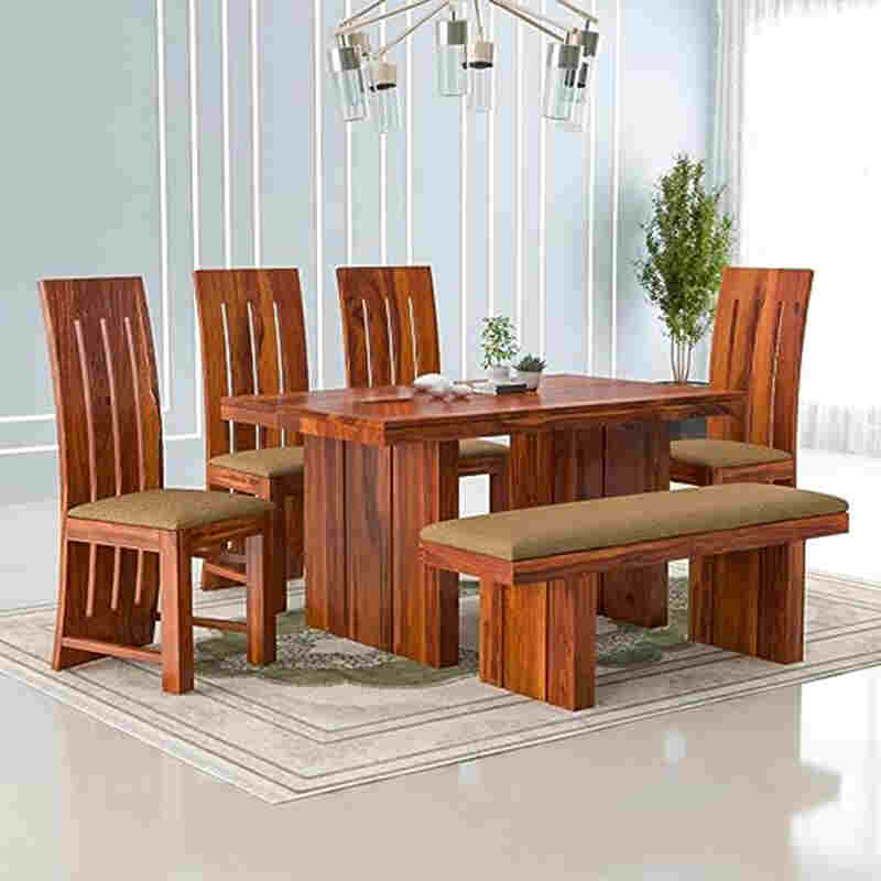 Wooden Dining Table Set with 4 Chairs and Bench in Cushion